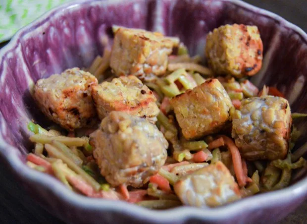 4. Toss broccoli slaw with sauce until coated. Top with cooked tempeh and sesame seeds, optional.