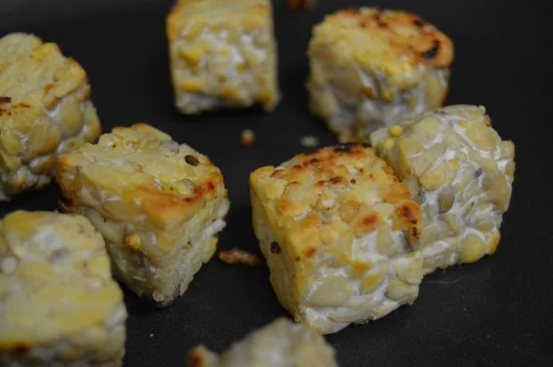 2. Chop tempeh into cubes and sautée them with a tsp of sesame oil for 5-7 minutes, or until golden brown.
