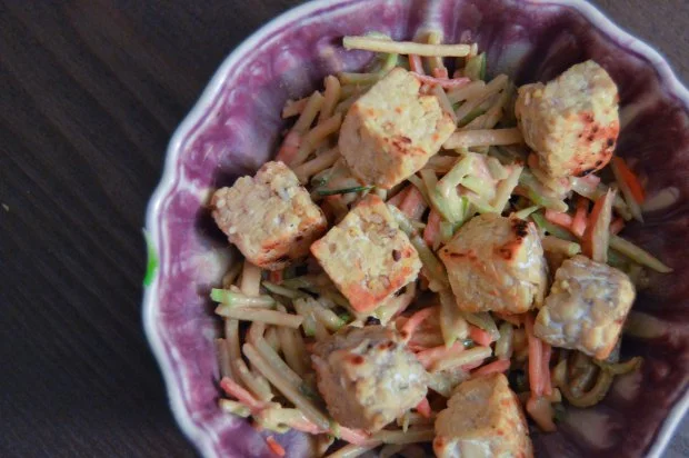 One of my favorite appetizers at chinese food restaurants growing up was cold sesame noodles. So with some healthy substitutions (mainly the broccoli slaw in lieu of noodles), I was able to recreate this takeout fav! I think I liked this version even better because I didn’t feel bloated and sluggish after eating it. It’s so fresh and flavorful and the sauce is UNREAL. Wondering what tempeh is? Tempeh is fermented soy, so it's better for you than its unfermented counterpart, tofu. The process of fermentation produces beneficial bacteria (often referred to as "probiotics"), which are essential to gut health. It also lowers the phytic acid content of the soy (and grains since may varieties include quinoa) which makes it easier to digest. Plus it has a much firmer consistency than tofu and cooks infinitely faster - win win!